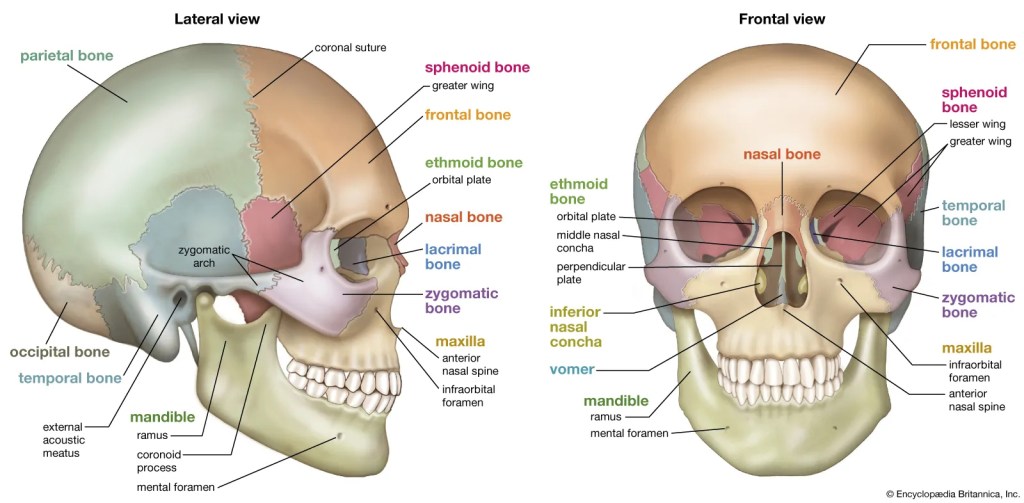 1. Made of 22 Bones: The adult human skull is made up of 22 bones—8 cranial bones that protect the brain and 14 facial bones.