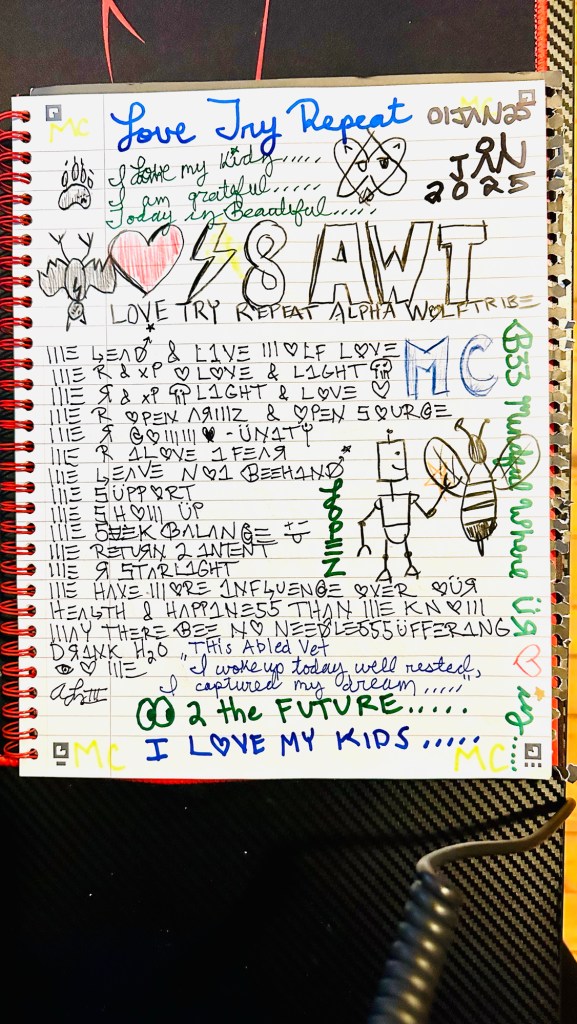 My goal is to have a daily practice with meditation, journaling, a post on this blog (I refer to this blog sometimes as TS&TSR) , an hour of effort with Alpha Wolf Tribe , yoga (at least stretching) and observation of gratuity.